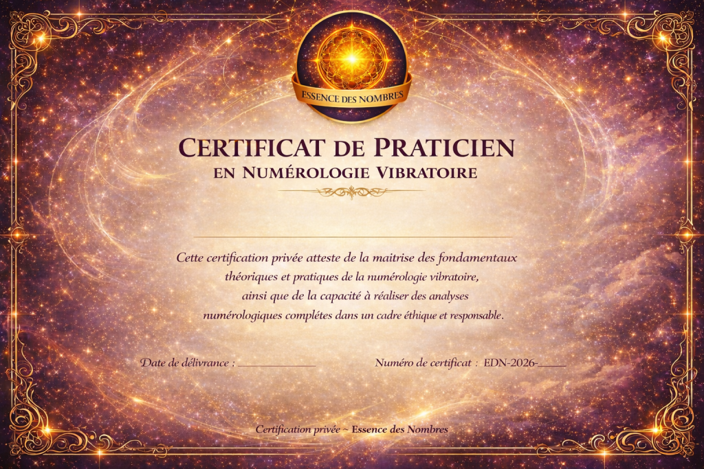 Obtenez une certification privée qui valide vos compétences et prépare votre avenir dans la pratique numérologique.